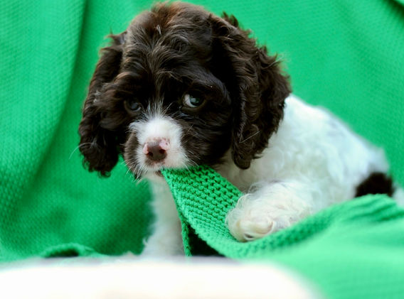 Flint is the only boy of the litter! He has an adorable speckled nose and has 'puppy dog eyes' down to an art! He loves to romp around and then take a power nap!